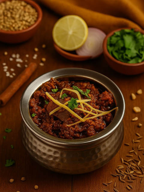 Naan bread filled with minced lamb with rich spices and baked in clay oven, served with curry.